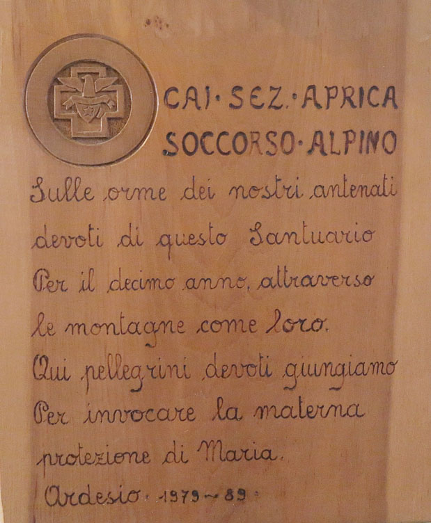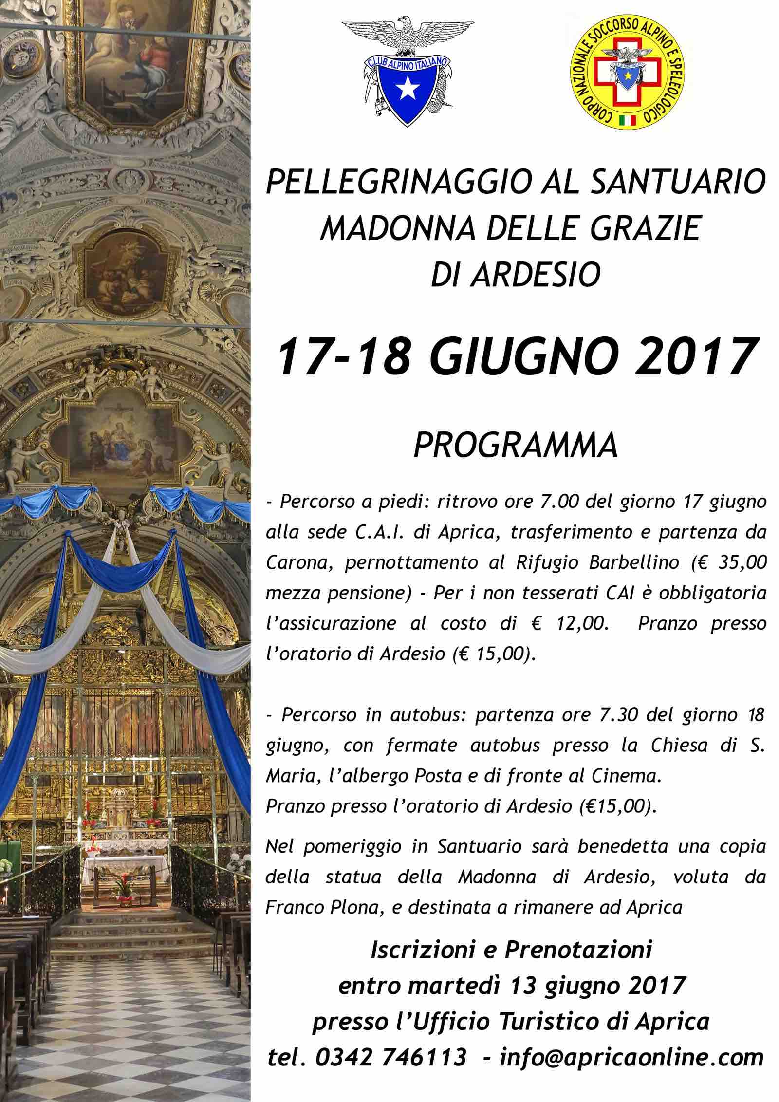 La partenza è fissata dalla sede del CAI Aprica alle ore 7 di sabato 17 giugno 2017. Si raggiungeranno Carona (in auto), il Passo di Caronella (2606 m), indi il Rifugio Barbellino (2129), dov'è previsto il pernottamento. Meno fatica la domenica, con però una bella camminata in discesa fino alla meta di Ardesio (Bergamo). Qui, nel nel santuario, ci sarà la benedizione di una copia della statua della Madonna di Ardesio, voulta da Plona e realizzata da Andrea Fanchi, che sarà poi conservata ad Aprica. Il rientro è previsto in autobus.