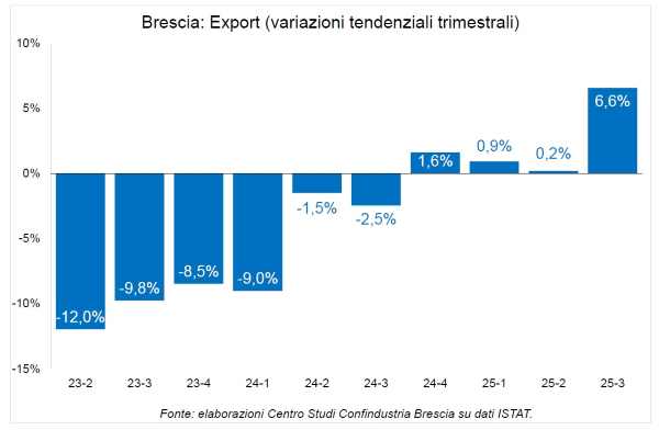 A rilevarlo sono i dati ISTAT elaborati dal Centro Studi di Confindustria Brescia. La buona performance bresciana risulta in linea con la media nazionale (+6,6%) ed è superiore a quella lombarda (+3,4%). La dinamica delle esportazioni realizzata dalle imprese del nostro territorio risulta nel complesso coerente con il quadro di consolidamento dell’attività produttiva riscontrato nel periodo estivo, all’interno di un più ampio percorso di stabilizzazione del Made in Brescia dopo la fase di debolezza rilevata lungo lo scorso biennio (2023-2024). Nel complesso dei primi nove mesi del 2025, le vendite all’estero (pari a 15.289 milioni) sono in crescita del 2,4% sul 2024, a fronte di una dinamica più modesta riscontrata in Lombardia (+1,8%) e del più elevato risultato dell’Italia (+3,6%). Per quanto riguarda le importazioni, nel periodo luglio-settembre pari a 3.016 milioni, si assiste a un incremento (+4,2% tendenziale), mentre negli interi primi nove mesi hanno raggiunto la cifra di 9.499 milioni (in aumento dell’8,0% sul 2024).