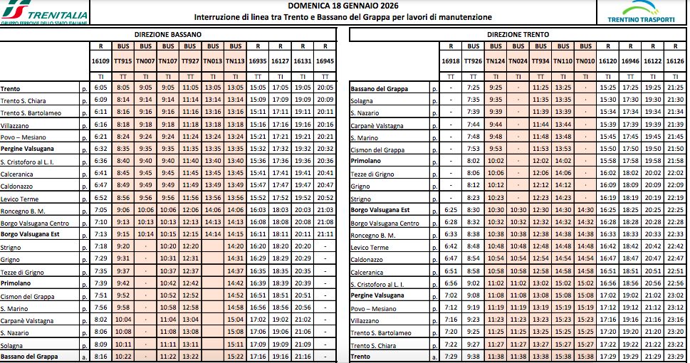 Sulla linea ferroviaria della Valsugana dalle 9 alle 15 di domenica 18 gennaio sono stati programmati lavori di manutenzione straordinaria: la circolazione dei treni tra le stazioni di Trento e di Bassano del Grappa è sospesa e le corse sostituite con i bus.