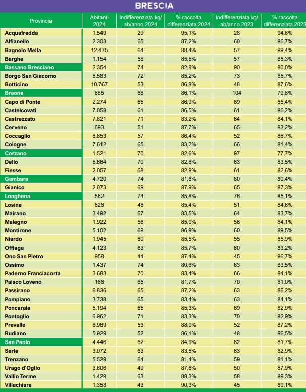 Legambiente Lombardia fanno riferimento all’anno 2024 e attestano un aumento del 3,1% rispetto al dato del 2023. Nella maggior parte dei Comuni della Valle Camonica sono stati registrati passi avanti, grazie alle iniziative messe in campo dai Comuni.