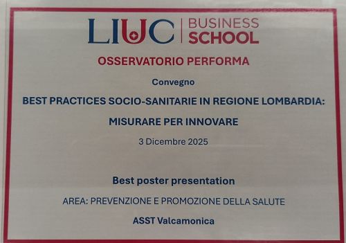Nell'ambito del convegno promosso dalla Liuc - Università Carlo Cattaneo - Business School di Castellanza (Varese) sul tema "Best Practices socio-sanitarie in Regione Lombardia: misurare per innovare", l'Asst della Valcamonica è stata premiata, tra le oltre 20 Asst partecipanti, per il progetto “Prevenzione e promozione della salute in Valle Camonica”.