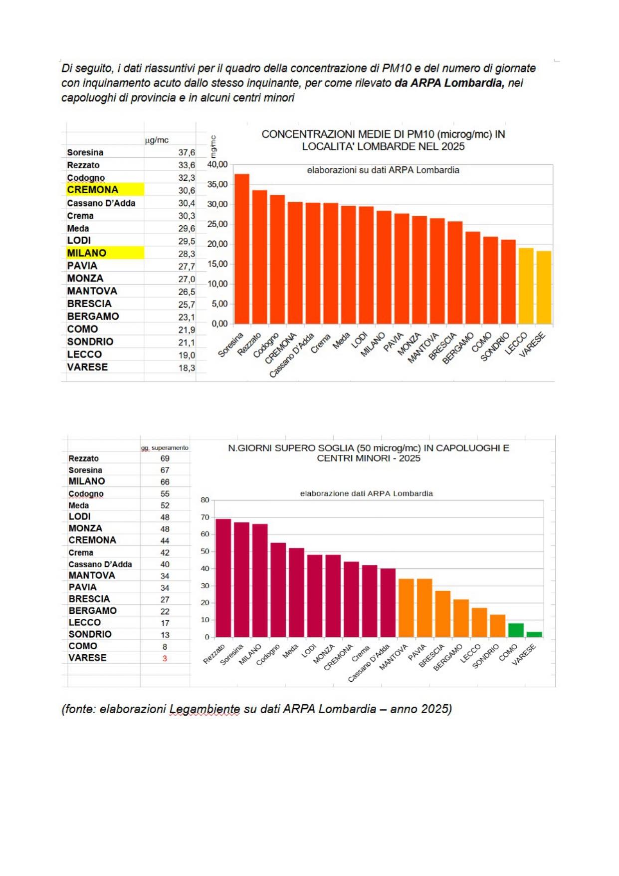 Cremona e Lodi si confermano come i capoluoghi in cui le concentrazioni medie di PM10 sono più elevate, perfino rispetto a Milano. Ma il dato più sorprendente non arriva dalle città, bensì dai piccoli e medi centri urbani: Soresina, ‘capitale’ lombarda del latte, è la località con i livelli di PM10 più elevati della Lombardia, e livelli molto alti si riscontrano anche nella circostante pianura, ad esempio a Crema, Codogno e Cassano d’Adda, mentre nel bresciano la centralina di Rezzato, pochi chilometri a est del capoluogo, mostra livelli molto alti nella media annua ed il numero record regionale di episodi di inquinamento acuto: in questo caso, oltre alla prossimità di aree ad elevata intensità zootecnica, pesano il traffico stradale e autostradale e la presenza di un cementificio, di cave e di impianti per la lavorazione della pietra.