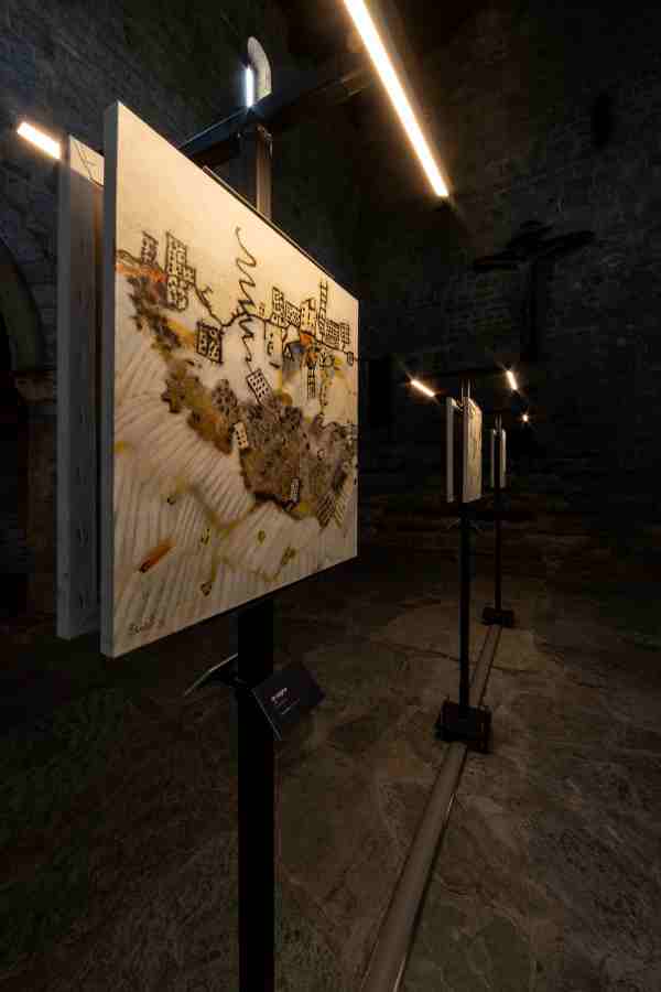 In questo contesto, la mostra costruisce la propria identità come intervento misurato e coerente: le opere non interrompono il silenzio della Pieve, ma lo animano, instaurando un dialogo profondo con lo spazio. All’interno della chiesa, essenziale e materica, i dipinti sembrano trovare una collocazione naturale, come se fossero da sempre destinati a questo luogo. Nulla interferisce con la relazione tra segno e pietra, lasciando che sia proprio questo dialogo a generare significato e a trasformare la visita in un’esperienza intima e contemplativa.