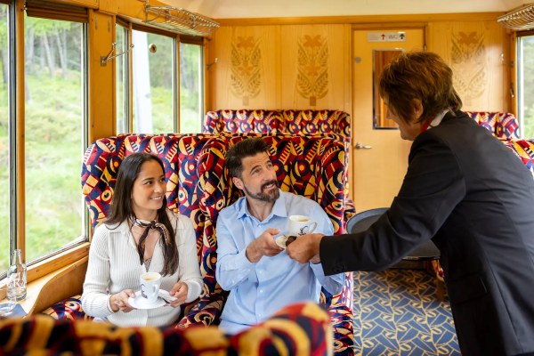 Due passeggeri nella carrozza Alpine Pullman Class accuditi dal personale addetto alla ristorazione.