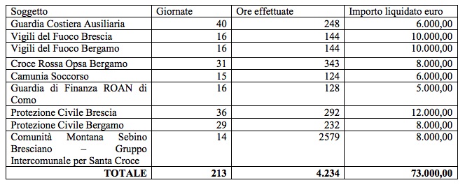 Numeri alla mano, la Guardia Costiera ha effettuato 40 giornate di servizio, la Croce Rossa 31, i gruppi di protezione civile bresciana 36, 29 quelli della provincia bergamasca: in totale, le giornate “coperte” sono state 213 (a fianco la tabella con la rendicontazione completa).