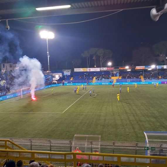 0' - Torcia in campo dalla curva nord, partita sospesa per due minuti e iintervento dei vigili del fuoco