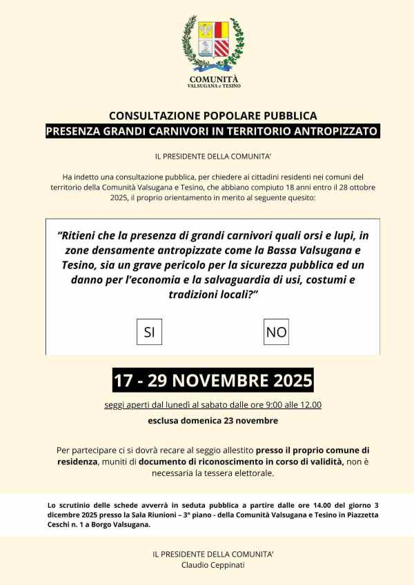 Per illustrare i contenuti e gli obiettivi deella consultazione è in programma domani - venerdì 14 novembre, alle 20:30, a Castello di Tesino - Palazzo Gallio - un incontro, moderato dal giornalista Gabriele Buselli. Sono previsti gli interventi del professor Michele Corti su "Il lupo in Italia predazione di animali e attacchi all’uomo"; del dottor Cristian Bolzonella su "Esempi di gestione dell’orso in Europa – problematiche e prospettive" e di Franca Penasa su "Progetti Life e analisi risultati consultazioni popolari già effettuate".