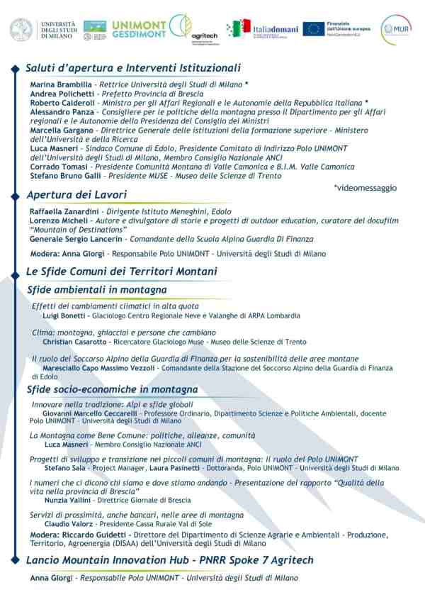 L’evento, che si terrà giovedì 11 dicembre 2025 presso il Polo UNIMONT dell’Università degli Studi di Milano e online, con la partecipazione di rappresentanti di istituzioni territoriali e nazionali di rilievo, sarà un momento di dialogo tra istituzioni e comunità per condividere esperienze, buone pratiche e approcci volti a rafforzare la capacità di risposta delle montagne e delle comunità locali.