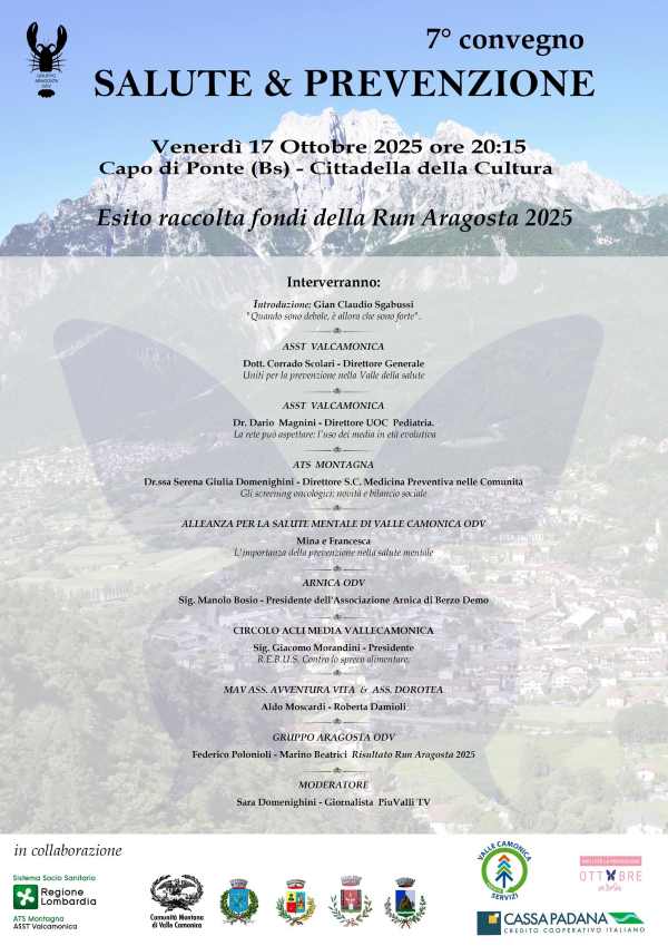 L'introduzione della serata, moderata dalla giornalista Sara Domenighini, sarà affidata al dottor Gian Carlo Sgabussi. Interveranno il direttore generale di Asst Valcamonica, dottor Corrado Scolari, e il dottor Dario Magnini, direttore UOC Pediatria, con informazioni preziose sulla prevenzione in età evolutiva, mentre la dottoressa Serena Domenighini di Ats Montagna fornirà aggiornamenti sugli screening oncologici, mentre le associazioni Alleanza per la salute mentale (Mina e Francesca) l'Arnica (Manolo Bosio) e il Progetto Rebus (Giacomo Morandini) parleranno dell'importanza di lavorare insieme per la prevenzione. Sono previsti gli interventi di Aldo Moscardi (Mav) e Roberta Damioli (Associazione Dorotea).